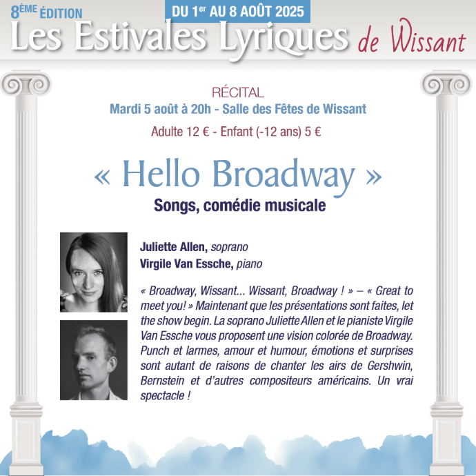 Maintenant que les présentations sont faites, let the show begin. La soprano Juliette Allen et le pianiste Virgile Van Essche vous proposent une vision colorée de Broadway. Punch et larmes, amour et humour, émotions et surprises sont autant de raisons de chanter les airs de Gershwin, Bernstein et d’autres compositeurs américains. Un vrai spectacle !