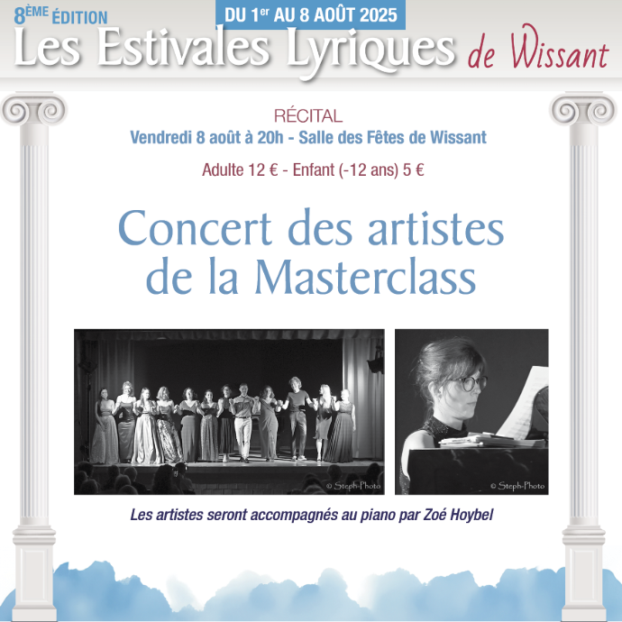 Pour clôturer en beauté cette 8ème édition des Estivales Lyriques de Wissant : le traditionnel concert des artistes de la Masterclass, soutenu par la brillante Zoé Hoybel au piano.
